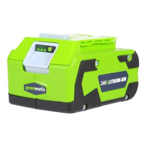 Аккумулятор "Greenworks" G24B используется с техникой GreenWorks серии G-24 24V. Батарея состоит из японских ячеек Sanyo. Снабжается встроенной электронной схемой управления. Особенностью Li-ion батареи является отсутствие "эффекта памяти". Важным преимуществом является быстрый заряд батареи: за 35 минут достигается 50% заряда, 100% заряд достигается за 90 минут. Для удобства, батарея снабжена индикатором уровня заряда и ударопрочным корпусом для защиты от механических повреждений.