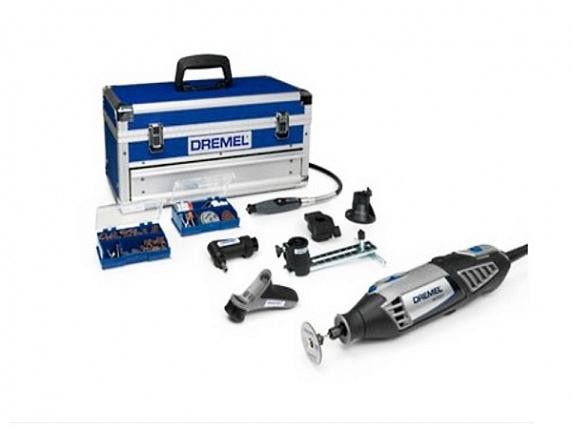 Мультиинструмент; 128 высококачественных насадок; Рукоятка для точных работ; Линейный фрезерный циркуль; Приставка угловая; Направляющая для резки; Шлифовальная платформа; Гибкий вал; Инструкция по эксплуатации; Алюминиевый кейс.