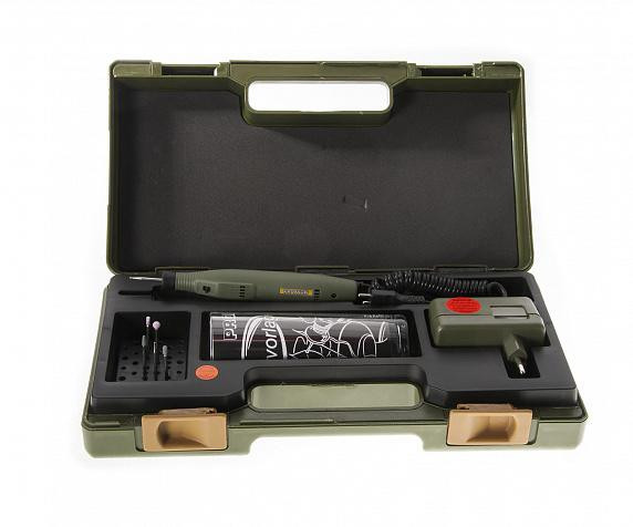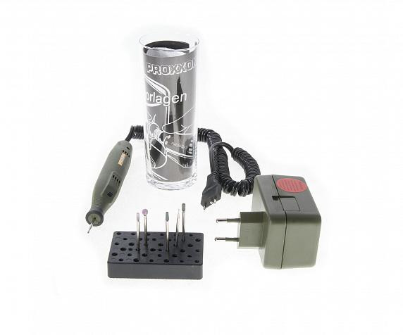 В комплекте сетевой адаптер, 5 насадок, пробный стакан, образцы узоров, кейс.