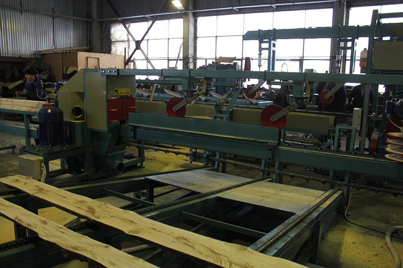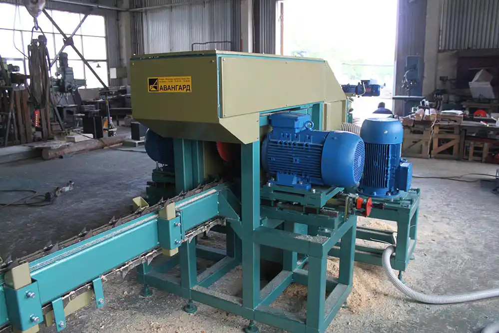 станок в сборе - 1 шт.; подающий конвейер для сырья длиной 3,0 м – 1 шт.; приводной приемный рольганг – 1 шт.; пильные диски ∅400 с подрезными ножами – 4 шт.