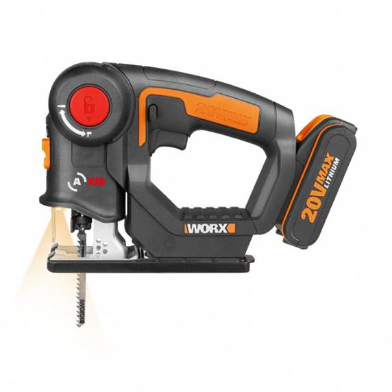 Лобзик аккумуляторный-сабельная пила WORX Axis WX550 для работ по дереву. Совместим со стандартными полотнами для лобзиков и сабельных пил. Замена оснастки без инструмента. Предохранительный переключатель. Шарнирная конструкция головки позволяет за несколько секунд переключить инструмент из режима пилы в режим лобзика.
