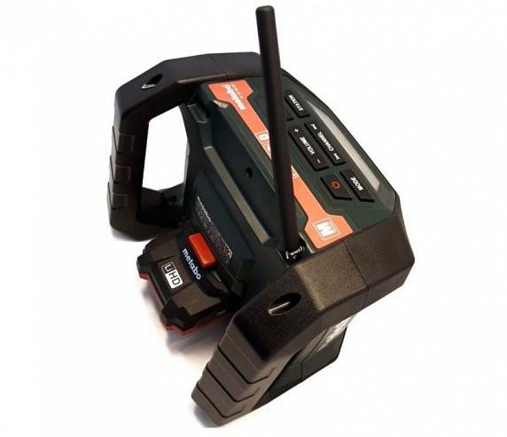 Радио+зарядное устройство "Metabo" R 12-18 BT. Bluetooth для проигрывания музыки с телефона. Заряжает слайдерные аккумуляторы Metabo 12 B, 14,4 В, 18 В. Защита от пыли и влаги. LCD подсветка дисплея. Эквалайзер. Гибкая антенна. 9 см динамик. DSP FM/AM тюнер.
