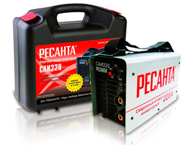 Инверторный сварочный аппарат Ресанта САИ-220 в кейсе подходит для сварки металлических конструкций постоянным током покрытым электродом до 5 мм. Сварочный ток регулируется от 10 до 220 А ровных сварных швов и для более точной работы.