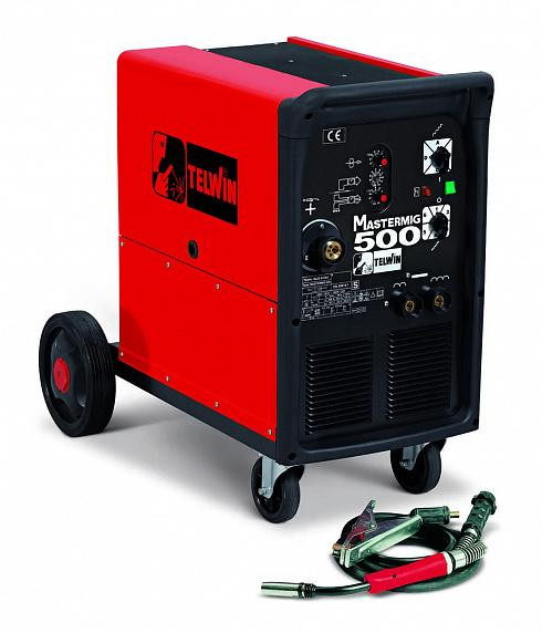 Сварочный полуавтомат TELWIN MASTERMIG 500 представляет собой надежное оборудование для проведения сварочных работ различной сложности. Конструкция располагается на прочной платформе с колесами, что упрощает перемещение. Изделие обладает корпусом с перфорацией и удобной рукояткой.