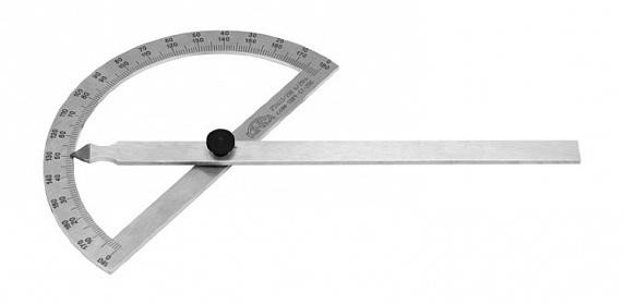 Угломер выполнен из нержавеющей стали, нанесено защитное INOX-покрытие. Транспортир оснащен удобным и надежным фиксатором. Диапазон измерений улов от 0 до 180°.