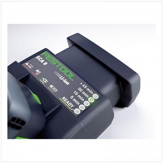 Зарядное устройство "FESTOOL" SCA 8 с новой технологией AIRSTREAM на 65 % быстрее производит зарядку. Оптимальное использование машинок с высокой потребляемой мощностью. Светодиодный индикатор показывает оставшееся время зарядки и уровень заряда