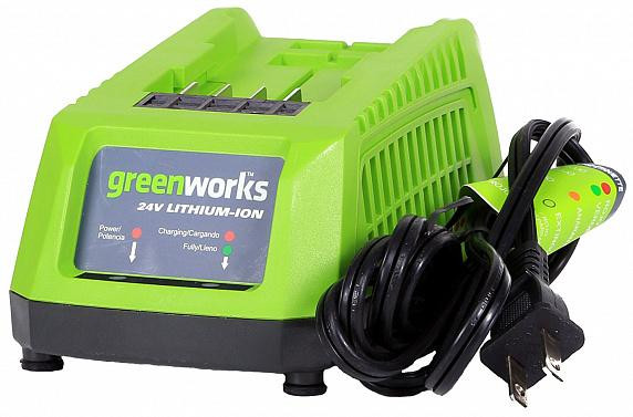 Зарядное устройство "Greenworks" 24В предназначено для зарядки литий-ионных аккумуляторных батарей 2 А*ч G24B2 (арт. 2902707) и 4 А*ч G24B4 (арт. 2902807). Данная модель обладает индикатором уровня заряда и системой защиты от перезаряда аккумулятора. При достижении 100% заряда питание автоматически отключается. Снабжен перфорацией для защиты от перегрева и прорезиненными ножками для устойчивости на плоскости.